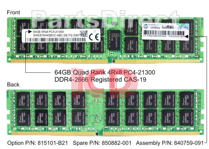 HPE 64GB (64GB) Quad Rank x4 DDR4-2666 CAS-19-19-19 Load Reduced Smart Memory Kit Part Number(s) Option Part# 815101-B21 Spare Part# 850882-001 Assembly Part# 840759-091 For 815101-B21Compatible Servers and Storage Arrays: Proliant BL Series: BL460c (G10)rnrnProliant DL Series: DL360 (G10) DL380 (G10) DL560 (G10) DL580 (G10)rnrnProliant ML Series: ML350 (G10)rnrnProliant XL Series: XL230k (G10)