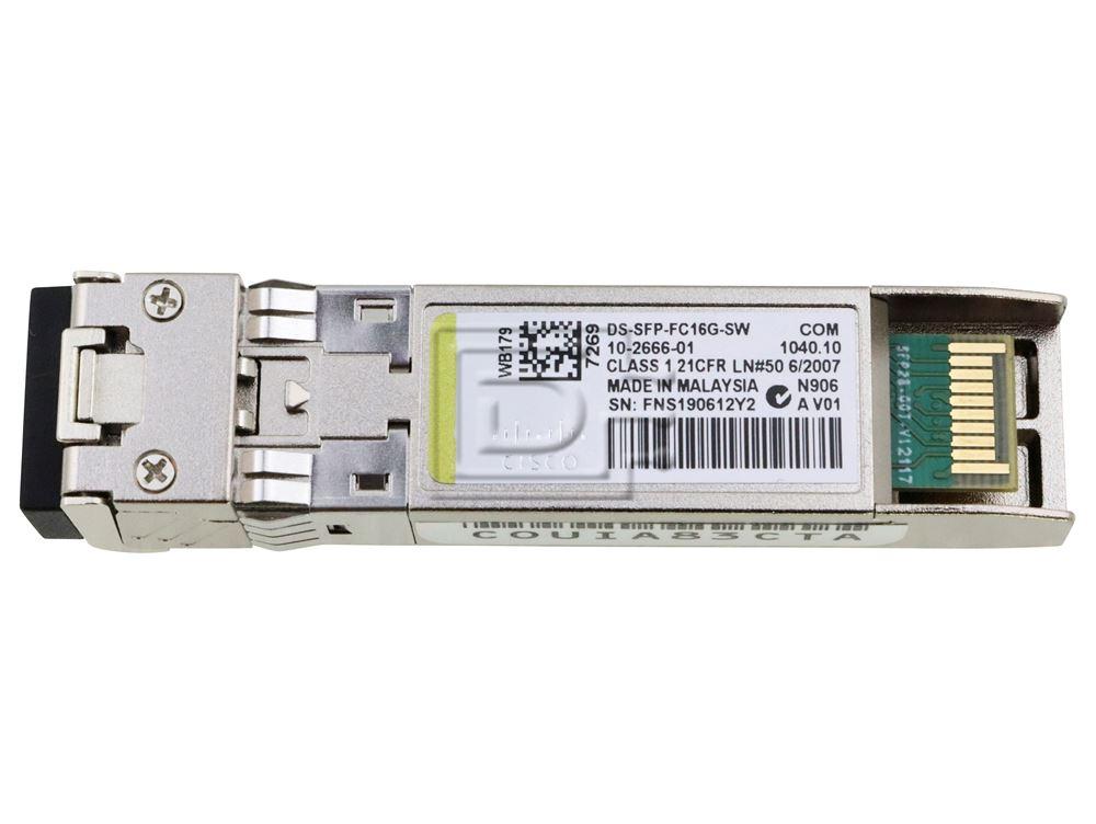 Cisco DS-SFP-FC16G-SW 16Gbps Fibre Channel Shortwave SFP+ Transceiver Module. LC Duplex connector, 850nm wavelength, up to 125m over OM3 MMF. Compatible with Cisco MDS 9000 Series switches and UCS Fabric Interconnects. For SAN/storage networking.